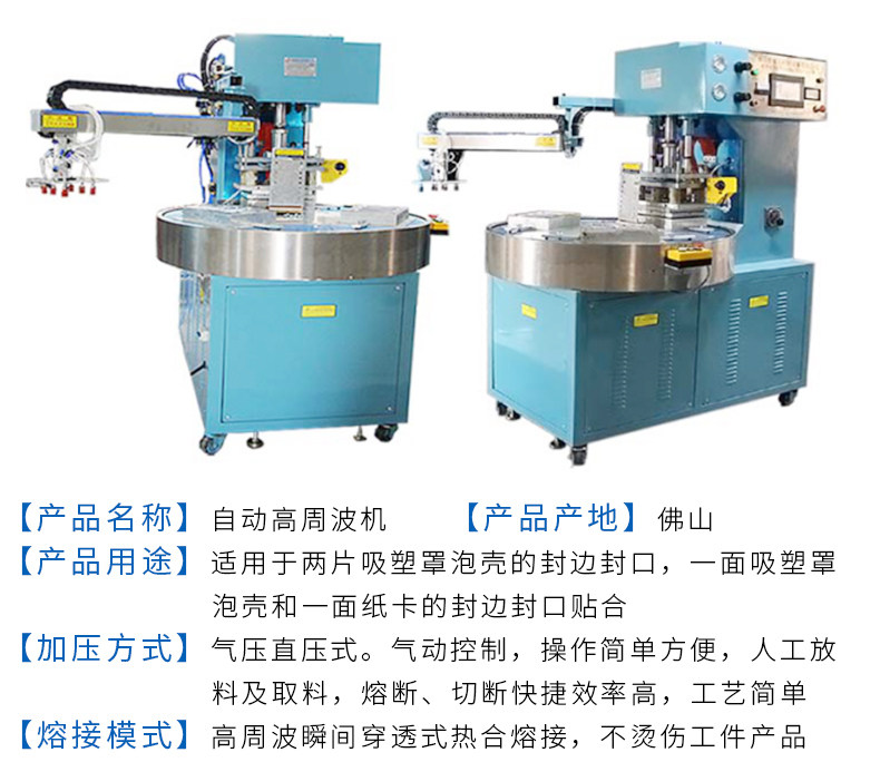 高周波自动封口机以自动转盘方式操作,上下模对位准确,高频,操控简单易懂,便于维护及保养,此机为圆盘360度旋转,分为四个工作位,即每180度为一个工作位,圆盘转盘方式以电机快慢由电机转动速度控制,其中高周波自动封口机电机配有变频器设置,可调控变频器控制电机转动速度,手动直接调到变频器旋钮,从而电机转换成圆盘的快慢,本机配有触摸屏控制整机动作、内置PLC工控集成系统,可便于以后更改机械控制程序或扩展其它机械应用功能、高周波自动封口机系统符合机械操作应用、也是现代化机械之趋势。